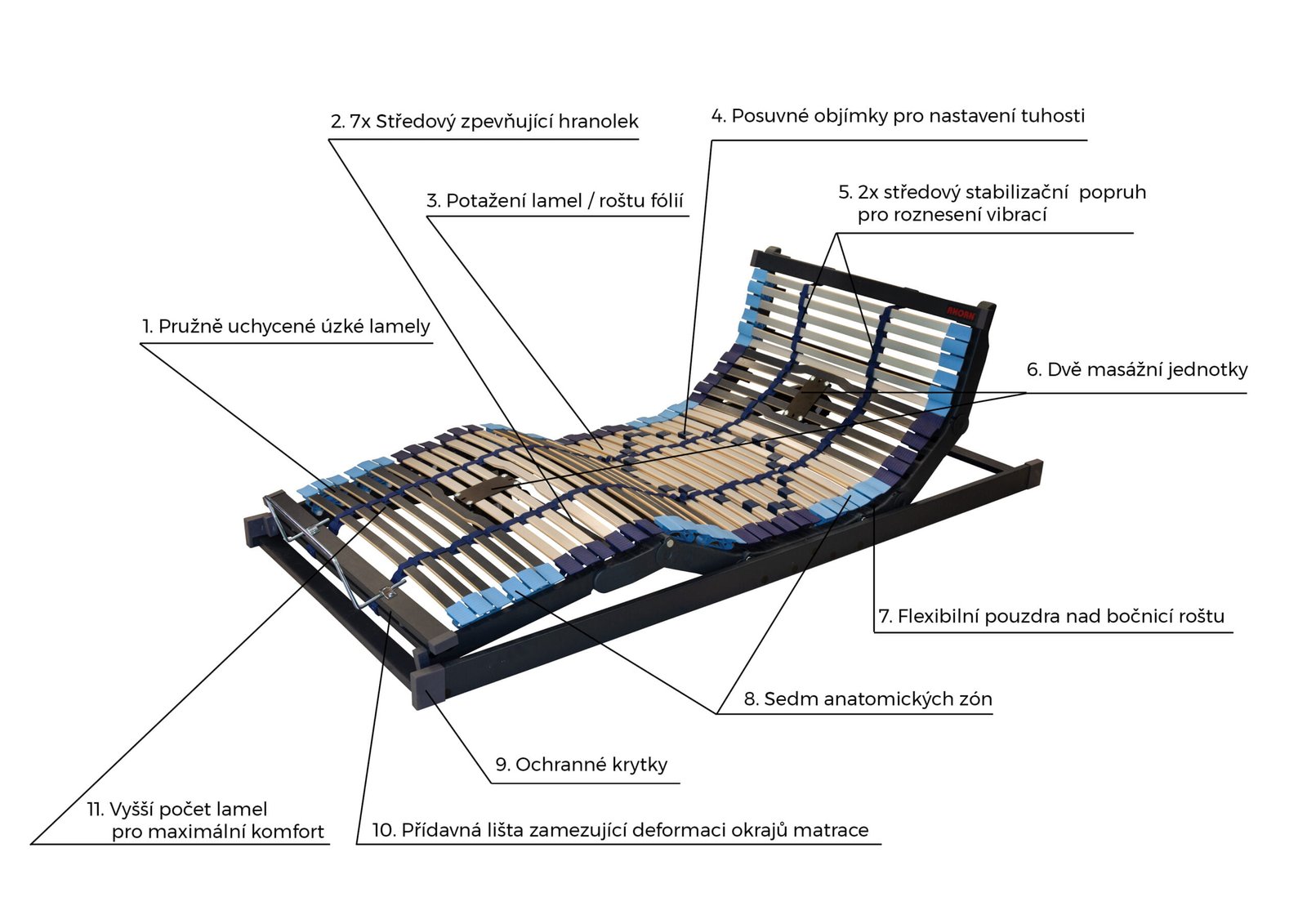 Rošt je vhodný také pro úložné prostory, motor umístěný v rámu konstrukce nezasahuje do prostoru pod lůžkem. Přídavná lišta rovnoměrně podpírá matraci po celé ploše a zamezuje její deformaci. Foliovaná povrchová úprava usnadňuje údržbu roštu a zabraňuje pronikání vlhkosti do roštu.