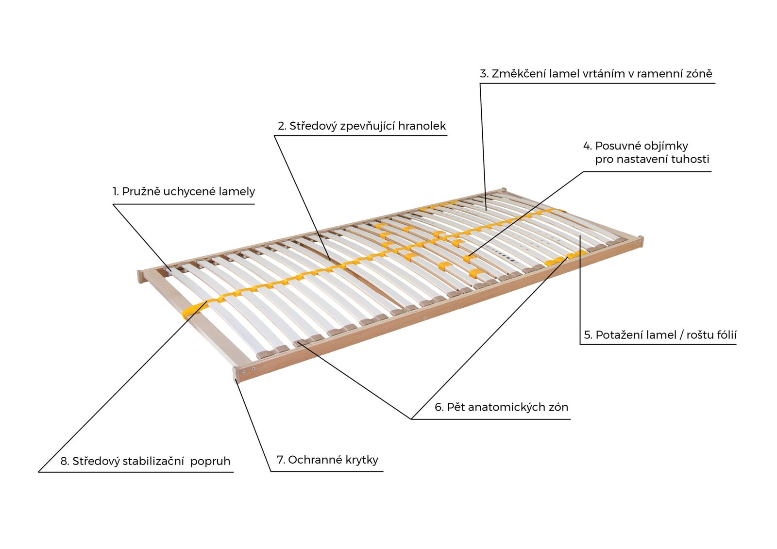 Praktický rošt Duostar je skvělou volbou pro pohodlné a zdravé spaní. Motorový rošt Duostar podporuje optimální rozložení váhy těla na matraci. Polohování roštu pomocí kompaktního motoru se dvěma nezávislými pohonnými jednotkami umožňuje zvednutí hlavové i nožní části lůžka. Rošt je svou výškou pouhých 7 cm přizpůsoben do nízkého lůžka, aby se matrace dobře usadila v postelovém rámu a nepřečnívala. Pružné lamely uložené ve dvojicích v kaučukových pouzdrech jsou rozložené do 5 anatomických zón. Vrtané lamely v ramenní oblasti zajišťují nižší tuhost a zmírňují tak tlak na ramena. Středový popruh zlepšuje stabilitu a nosnost roštu. Posuvnými objímkami lze nastavit individuální tuhost v bederní části. Lamely opatřené fólií mají schopnost zachytávat pod matrací méně prachu, zamezují zatrhávání potahu a přenášení vlhkosti z matrace do roštu, což je plus, které ocení především lidé s alergií. Tento rošt je dodáván s dálkovým šňůrovým ovládáním.