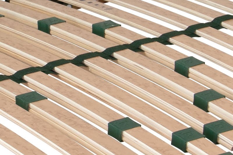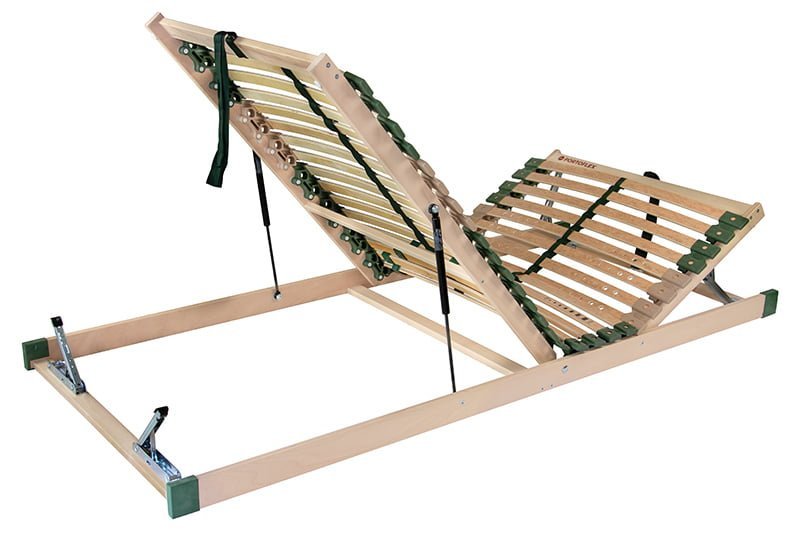 Pohodlný a odolný rošt s pouzdry uloženými nad bočnicí poskytuje vyšší komfort při spánku. Rošt s vyklápěním nožní části pomocí pístu vám zajistí jednoduchý přístup do celého úložného prostoru pod lůžkem. Zároveň lze rošt napolohovat v oblasti hlavy i nohou pro pohodlí a relax na lůžku. Speciálně uložená výkyvná pouzdra zaručují vyšší nosnost a odolnost proti prudkému zatížení. Pružné lamely v 7 anatomických zónách se natáčejí a reagují na pohyb těla při spánku. Každá část těla je tak individuálně podepřena. Změkčení v ramenní oblasti je správnou oporou páteře při spánku na boku. Středový popruh zlepšuje stabilitu roštu. Posuvnými objímkami lze nastavit individuální tuhost v bederní části. Lamely opatřené folií zabraňují pronikání vlhkosti do roštu a usnadní údržbu roštu.